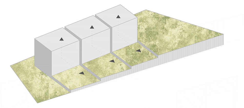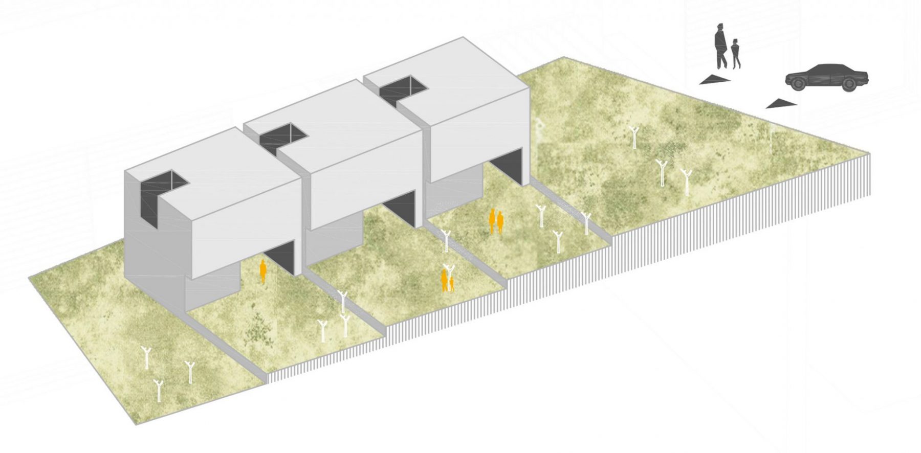 Ideja stvaranja tri istovjetne jedinice za život koja svojim osnovnim postavkama pruža budućem stanaru mogućnost različitog korištenja prostora na temelju povezanih funkcionalnih zona interijera i eksterijera kuće. Volumen svake jedinice se odmiče od susjedne da bi stvorio bolje poglede, otvorio se prema kontekstu, ali zadržao privatnost unutar vlastite ovojnice. Ovojnicu odlikuju jasne i jednostavne linije koje su naglašene igrom različitih materijala. Atraktivni volumen stvoren je različitim prostornim odnosima između vanjskog i unutrašnjeg prostora, a time i obogatio kvalitetu življenja.