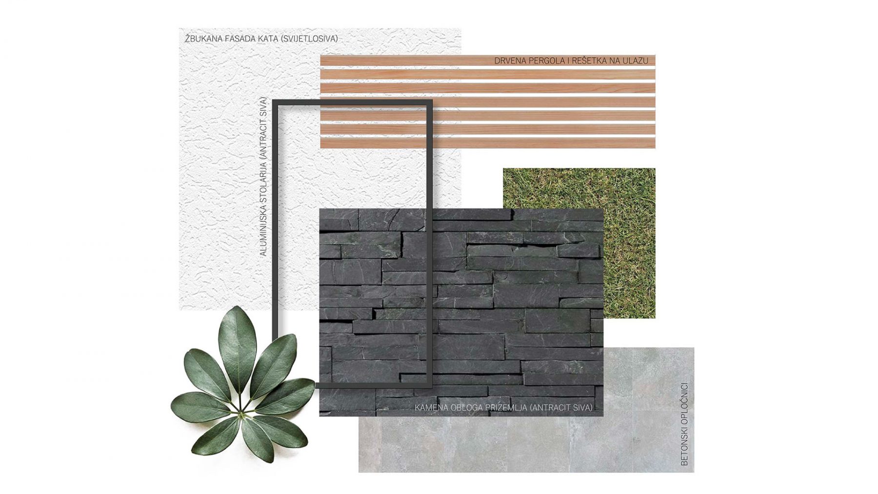 Identitet vanjskog prostora čita se kroz slojeve materijala koji su utkani u ovojnicu fasade, ali i u samom zelenilu. Kontrast tome je oblikovanje interijera koji bi trebao predstavljati neutralnu bazu za život i karakter budućih stanara. Odabrani materijali i boje stvaraju osnovnu koja će se u potpunosti prilagoditi zamišljenom životu unutar volumena stana.